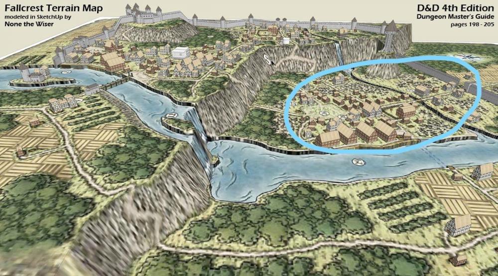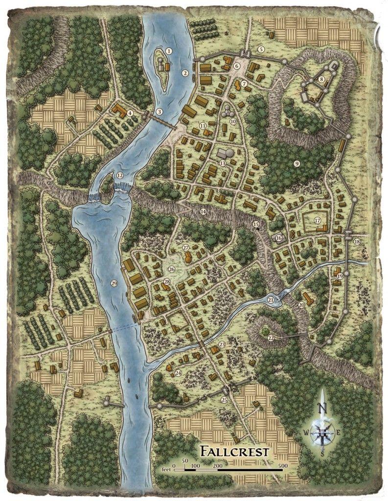 CAPITOLO 8: FALLCREST La città di Fallcrest è situata al centro della Valle del Nentir, esattamente dove si trovano le cascate del fiume. Per via della sua posizione, esattamente al crocevia fra la Strada Commerciale e la Strada del Re, Fallcrest è il luogo principale dove i mercanti di tutta la valle si incontrano! La maggior parte delle terre limitrofe, sono abitate da numerose famiglie contadine, e la popolazione che vive fuori dalle mura è di circa 10000 abitanti mentre quella situata all’interno raggiunge circa le 5000 unità. Coloro che abitano fuori si guadagnano da vivere coltivando la terra e allevando il bestiame, mentre all’interno delle mura l’economia gira grazie agli artigiani, e ai mercanti. Molti inoltre lavorano come scaricatori, infatti le imbarcazioni che navigano lungo il Rurian, ad esempio le barche del Casato Azaer, hanno bisogno di uomini che trasportino la merce via terra per poter superare l’ostacolo rappresentato dalle cascate. STORIA Fino a nove secoli fa, questa zona era una terra di confine completamente disabitata, fatta eccezione per una piccola comunità elfica situata nella Foresta di Harken e per la città-fortezza nancia di Hammerfast. Con il consolidamento del potere dell’Impero Narethiano, e la costruzione di una serie di fortificazioni, iniziarono ad arrivare alcuni coloni umani che cominciarono ad insediarsi nelle fertili terre della Valle del Rurian. Nel 1112 AI, fu fondata una fortezza ai piedi delle cascate del fiume Rurian, da parte del giovane cavaliere Bran Markelhay. Tuttavia la fondazione della città di Fallcrest avvenne nel 298 AF, alcuni secoli dopo la caduta dell’impero. I successivi due secoli furono un ottimo periodo per il paese di Fallcrest: il commercio era naturalmente favorito dalla sua posizione e i Markelhay lo governavano con saggezza! Quando l’Antico Patto fu infranto ed iniziarono le Guerre Oscure, cominciò per Fallcrest un periodo di declino. Con la fine del lungo conflitto, iniziò una lenta ricostruzione, in parte vanificata quando ottant’anni fa un’orda di orchi, conosciuta come la Tribù delle Lance Insanguinate, invase la vallata scendendo dalle Montagne del Wolfsktag! L’esercito della città fu sconfitto sui Colli Gardbury e Tornor fu saccheggiata e il Lord Guardiano ucciso. Adesso la città si sta riprendendo, anche se oscure ombre si affacciano sul suo futuro. LA CITTA’ Popolazione: 5000 abitanti residenti all’interno delle mura e 10.000 abitanti, nelle campagne limitrofe. La popolazione è composta da umani, e in piccolissima parte da nani. Governo: Monarchia Elettiva, retta da cinque Casate Nobiliari, discendenti dei fondatori della città. Una volta eletto, il nobile, si occupa di impartire la giustizia, di difendere la città e di amministrare le leggi, oltre ad acquisire il titolo di Lord Guardiano e Protettore della Valle del Nentir. Dalla fondazione della città fino ad oggi, a ricoprire tale carica sono sempre stati gli eredi della famiglia Markelhay. LE CASATE Markelhay: sono i veri fondatori della città. Bran Markelhay fu il primo Lord Guardiano della storia (1112 AI). Nereth: antica famiglia, originaria delle terre di Brom, che da sempre si sono dimostrati servi leali della famiglia Markelhay. La maggior parte delle guardie cittadine provengono da questo casato. Kamroth: la più ricca famiglia della città. Sono grandi proprietari terrieri che riscuotono gli affitti di numerosi contadini e pastori situati nelle campagne vicine ad est del fiume Rurian. Selduzar: originari della città di Liamaden, sono proprietari terrieri di vasti appezzamenti situati sulla sponda occidentale del fiume Rurian. Sono in contrasto con il casato dei Kamroth. Azaer: questo casato ha saputo farsi valere soprattutto negli ultimi 80 anni, quando si è reso protagonista della ricostruzione della città in seguito alla Guerra delle Lance Insanguinate. Possiedono l’unica compagnia fluviale della città che prende il nome del casato stesso (Azaer Company). Difese: La difesa della città è affidata alla Guardia Cittadina, che annovera tra i suo ranghi circa 120 uomini. La caserma dove soggiornano è situata all’interno della Fortezza della Luna. La città è protetta da due lati da imponenti mura, e da un erta rupe e dallo scorrere impetuoso della acque del fiume, sugli altri due. Templi: Nella città di Fallcrest c’è un unico grande tempio, dove possono essere riveriti tutti I Veri Dei, ed è situato nella parte alta della città. A guidare i religiosi del tempio c’è una donna di mezz’età di nome Liona, chiamata Reverenda Madre. Locande: La Locanda dell’Unicorno è la più rinomata della città, caratterizzata da un servizio impeccabile ma dai prezzi molti alti, mentre la Locanda del Ponte, è la migliore per il rapporto qualità-prezzo ed è frequentata dalla maggior parte dei viaggiatori. Taverne: In città ci sono tre luoghi dove è possibile fermarsi a bere e mangiare. La Birreria del Colle e la Birreria dello Gnomo, sono piuttosto cari, mentre la Birreria dei Moli, offre dei prezzi contenuti, ma è anche un luogo piuttosto movimentato. Città: La città di Fallcrest è divisa in due distretti chiamati rispettivamente Città Alta e Città Bassa. La prima è la parte più antica, ed è il cuore amministrativo ed economico della città, dove risiedono i nobili ed i ricchi mercanti, mentre la seconda, di costruzione più recente, ospita la maggior parte della popolazione caratterizzata da diversi ceti sociali. LUOGHI PRINCIPALI La città di Fallcrest è divisa in due distretti, una parte bassa e una parte alta, separati dall’erta rupe (14) che da origine alle cascate del fiume! La parte bassa è chiamata Città Bassa, poiché gli edifici originali furono completamente distrutti dopo la Guerra delle Lance Insanguinate e costituisce anche la parte più povera della città. La parte alta è chiamata invece Città Alta, poiché è costituito da molti edifici sopravvissuti ai saccheggi della