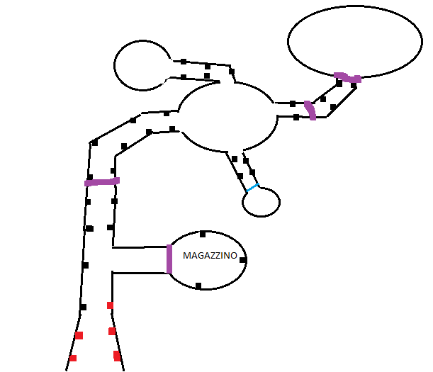 Vediamo se a descrivere ambienti e incontri sono scarso come impostare le basi dell'avventura. Allego a questo capitolo una bozza della mappa della miniera, non vi sono le proporzioni, quelle vedrò di metterle man nano avanzo con la sua descrizione, è giusto per dare un'idea della sua struttura. Di seguito la legenda: puntini rossi torce già accese, puntini neri torce spente, righe viola trappole, riga azzurra piccola illusione. (sempre liberi di apportare le vostre modifiche) Si tratta di una miniera di ferro, è abbandonata per scarso ritrovamento dello stesso, l'elfa druido avrà alcuni piccoli handicap: non si potrà appoggiare alle pareti; il suo stato di trans/meditazione per i riposi durerà il 25% in più (1 ora) se riposa su un giacilo, se no raddoppia il tempo; riceve un malus nelle prove di percezione. LA MINIERA Per accedere alla miniera ce un buco di 4 m di larghezza per 3 m di altezza, questo da su un salto di 4 m; per scendere il "nano" fornirà una scala di corde. Due dei quattro personaggi che ho suggerito all'inizio hanno la scuro visione, l'aasimar e l'elfo. I corridoi della miniera sono 2,5 m di larghezza per 2,5 di altezza. Scesi dalla scaletta, vi sono le prime torce accese, la distanza per tutta la miniera tra le torce è raggio di luce normale + metà del raggio di luce fioca (dunque 6 m + 3 m se non erro ), quindi le torce accese mostrano le successive spente. Al primo bivio sulla destra, se si prosegue di 12 m vi è il magazzino, sul suo uscio vi è una trappola, qualcosa di semplice, ad esempio una buca camuffata che se ci finisce sopra, si cade dentro con danni minimi. Il magazzino è una stanza circolare con raggio 8 m, al suo interno vi è il primo incontro ostile con 2 goblin. Nel magazzino non v'è nulla di che (casse vuote, piccoli cumuli di pietre ), se non 2 picconi i quali si possono dare anche come armi ai goblin. Questi 2 picconi possono tornare utili per uscire dalla miniera (si scava per avere delle pietre con le quali si fa un cumulo per raggiungere la sommità, ma i pg possono inventarsi altre cose ovviamente), infatti appena tutto il party ha girato dalla parte del magazzino o non ha più in vista la scala, questa viene issata di sopra dal "nano". Esplorato il magazzino o meno sulla parte di miniera che continua, come si vede dalla bozza, oltre che a varie torce spente, vi è una trappola e una svolta a destra, dopo la quale si apre un'enorme stanza. Appena si arriva all'interno della stanza, qui la luce delle ultime torce arriva appena, si viene attaccati da 2 topi giganti; in seguito i pg possono notare un sistema di illuminazione della stanza a combustibile liquido e accendendolo questi illumina tutta la stanza. La stanza è un rettangolo 15 x 35 , altezza 7 m, al suo centro vi sono una decina di goblin armati in vario modo ( es. 2 archi corti, 2 lancieri, 4 spada corta, 2 spada corta e scudo). Sconfitti i goblin ecco altri dettagli della stanza: a 3/4 della stessa rispetto a dove è entrato il party sia a destra e a sinistra ci sono 2 corridoi e in fondo alla stanza un terzo. La svolta a sinistra, dopo il corridoio ci si trova in una stanza circolare illuminata di raggio 8 con 6 goblin ad attendere l'arrivo degli intrusi. La svolta a destra , solito corridoio con le torce spente poi un muro di sassi, che si rivela un'illusione facilmente smascherabile ( se l'idea non piace in quanto non proprio appropriata vista la mancanza di specifici ed effettive entità magiche tra i nemici che abbiano fatto ciò, fate a meno di questa e arrivate allo stanzino che v'è dopo). Dopo l'illusione vi è una piccola stanza 5 m x 5 m dove si trova il corpo di un vecchio nano, il vero zio del barista di Alkur, e una cassa con incisioni in nanico, scassinata e vuota. Se si prosegue per la via centrale si va sempre più in profondità nella miniera, vi è una trappola all'inizio del corridoio, poi finito questo dopo una svolta a sinistra si apre un'altra ampia stanza. Anche qui vi è un sistema che porta ad illuminare l'intera stanza, non però raggiungibile; la trappola presente alla soglia sono dei massi che chiudono la via di fuga una volta che il party è entrato nella stanza. Appena la trappola che chiude la via di fuga è attivata la stanza viene illuminata. Perché non far cadere i massi addosso al party, la trappola è attivata da stupidi goblin, perché i goblin accendono le luci della stanza, bhe se no i loro arceri non vedevano fino in fondo alla stanza. La stanza ha la forma all'incirca circolare, ma è un 30 m x 35 m, 8 m di altezza. A 20 metri dall'entrata, sulla sinistra sopra ad una parete a 2 m da terra 3 goblin con arco corto, sotto di loro 1 goblin capo e 7 goblin con armi varie. In fondo a questa stanza vi è una sorta di baracca fatta di legno. Quando il goblin capo rimane solo e quasi morto o comunque i goblin sono ormai sopraffatti, dalla baracca esce un bugbear. Suggerisco un goblin capo con qualche pf in meno rispetto lo standard, il bugbear modellarlo in base alle condizioni del party per non ucciderlo subito. Dentro la capanna di legno si trova un piccolo tesoro, i risparmi del vecchio nano, una dozzina di monete d'oro a testa, circa (valutare se elargire esperienza con questo "tesoro"). I massi all'uscita chiusa possono essere facilmente spostati dai pg più forti per poter uscire dalla stanza. Il dungeon della miniera è finito, dovrebbero essere circa di 2000 exp guadagnate in totale se vi è stato un riposo con incontro; magari prima dello stanzone finale. Ora finito con i nemici ce da uscire dalla miniera, come detto prima le scalette sono sparite, ce da ingegnarsi sul come uscire, si posso usare i picconi, si può cercare di lanciare il kenku di sopra, visto che dovrebbe essere il più leggero, per farsi calare la scaletta o semplicemente far dar sfogo all'inventiva del gruppo. Usciti dalla miniera la casetta del nano è vuota, ma lo si noterà poco più distante, con altre 2 figure che poi se ne andranno mentre lui verrà in co