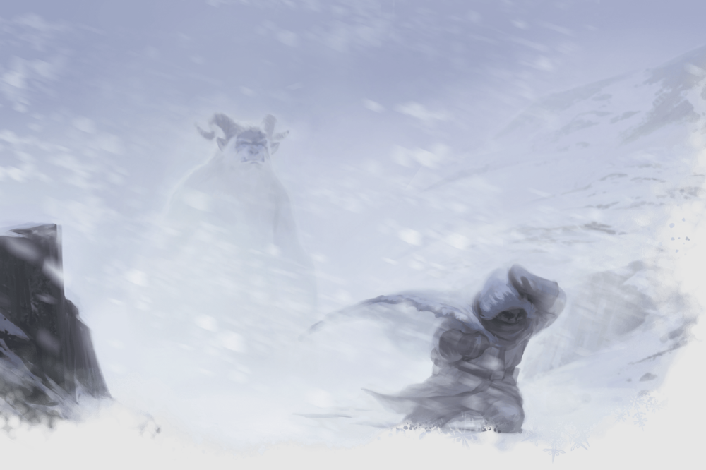 Icewind Dale è rimasta intrappolata in un inverno perpetuo. Il sole non compare nemmeno in estate, la notte è quasi totale da due anni oramai, il freddo regna sovrano, gli abitanti danno la colpa di tutto questo a Auril, il dio dell'ira dell'inverno. La gente qui vive in insediamenti conosciuti come Ten-Towns, i problemi dati dal tempo sta isolando sempre più queste città, ognuna di queste cerca di placare l'ira del dio con sacrifici, fallendo miseramente. Per avventurieri come voi, Ten.Towns è un luogo dove mettere alla prova il proprio coraggio e lasciare il segno su questa terra gelida e desolata. DM Siete in viaggio da mesi oramai, la neve vi arriva alle ginocchia e il vento impervia contro di voi, ma ormai dovreste essere quasi arrivati alla città più vicina delle Ten-Towns, Brema. Non avete una mappa e non esiste una strada (non più, siccome coperta di neve), ma vi hanno detto che seguendo la strada a destra di dove il sole tramonta sareste arrivati a destinazione, il freddo però vi sta entrando nelle ossa, sia per i giorni trascorsi in grotte umide sia perchè non siete stati così accorti nel comprare vestiti più pesanti, ma dovreste essere quasi arrivati...o no?