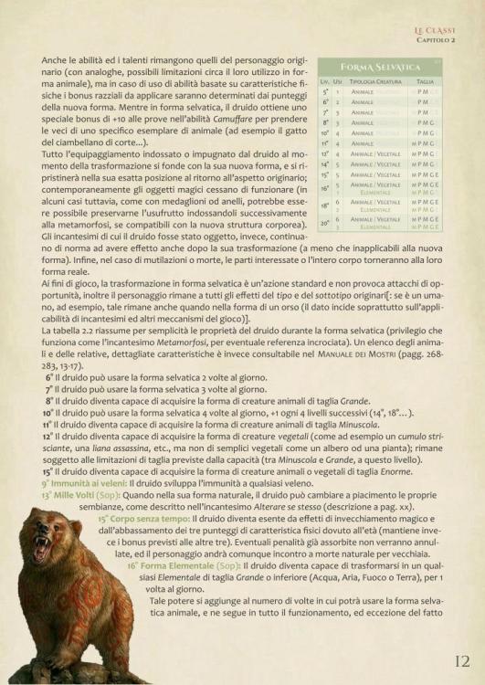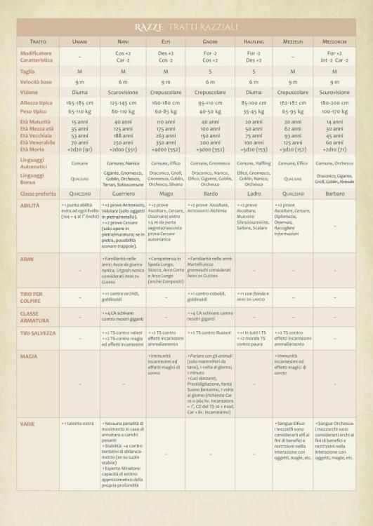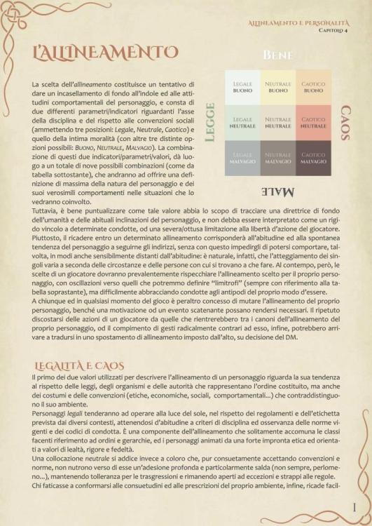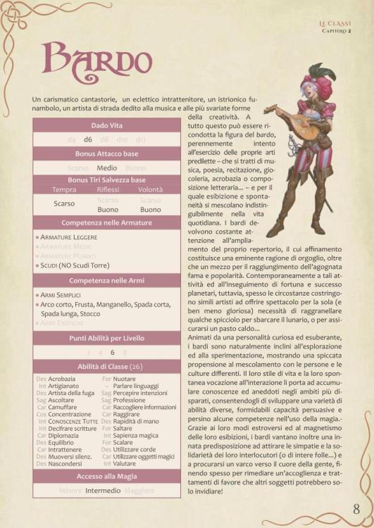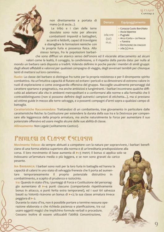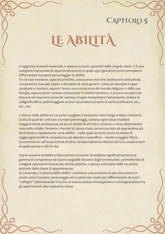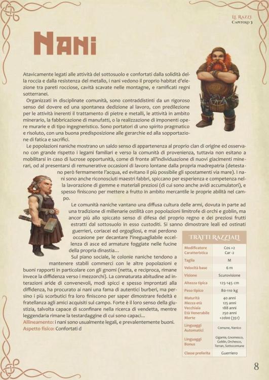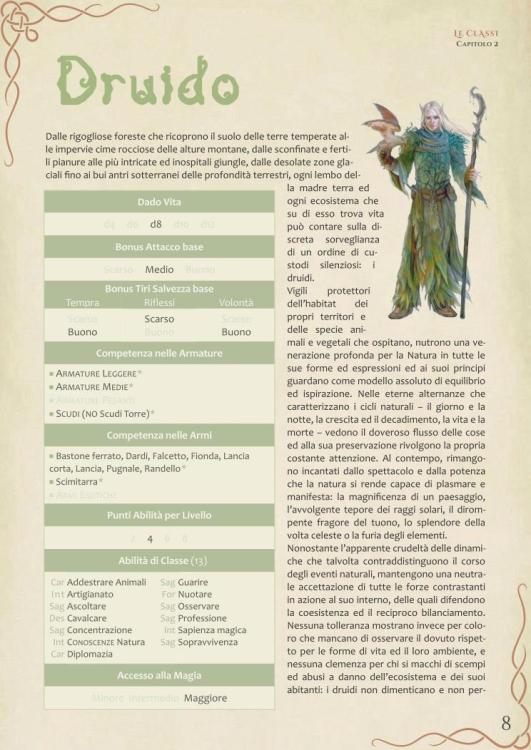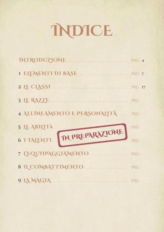 Un saluto a tutti, mi paracaduto su questo forum dopo che nel non così vicino anno 2020, in balia dell'improvvisa alluvione di tempo libero che il lockdown produsse, venni colto dalla malsana idea di approntare una "breve sintesi" del manuale ufficiale d D&D 3.5, onde introdurre il nipote ed il rispettivo gruppetto di amici al nerd-universo del gioco di ruolo. L'abbondanza della risorsa temporale e le nobilissime finalità pedagogiche alla base, unite ad una inaugurabile tendenza al perfezionismo e alla cura del dettaglio, fecero rapidamente degenerare i miti propositi iniziali in direzione di una massa considerevole di pagine, guarnite da formidabili illustrazioni e impreziosite da tabelle riccamente intarsiate... Dopo una quantità abnorme di ore dedicate a tale sporca faccenda nel biennio 2020/21, tuttavia, la magna opera si è purtroppo incagliata, successivamente rimanendo abbandonata fra solitarie cartelle digitali e ricoperta da una spessa coltre di bytes. Oltre a restare rigorosamente incompiuta. Ebbene, ad appena un quinquennio di distanza, mi sarei persuaso a rimettere le mani su quanto precedentemente forgiato e a gettarlo in pasto alla comunità, nel non impossibile caso che qualcuno potesse trovarlo utile (se non addirittura celestiale!!!). Venendo a più compiuti dettagli: siffatto manualetto - allora battezzato "Compendio delle Regole" - sognava di fare una sintesi di tutti i contenuti del Manuale del Giocatore ufficiale, ad eccezione della descrizione degli incantesimi. Ciò, con tutta verosimiglianza, non avverrà mai. Però la maggior parte dei contenuti relativi alla creazione del personaggio ed alla scelta delle varie caratteristiche (classe, razza, abilità, talenti, etc.) sono semicompleti o non così lontani dal diventarlo. In particolar modo la ingombrante sezione dedicata alle classi, a cui le massime cure ed attenzioni erano state rivolte in fatto di concentrazione di informazioni utili al gioco, diventando un po’ il perno del manualetto. Sicché, il proponimento sarebbe quello di mettere qualche toppa qua e là per completare le sezioni dove mancassero piccole parti, rassegnarsi a qualche incompiutezza, e condividere il tutto più o meno allo stato di completamenti in cui si trova (eventualmente mutando anche il titolo in un più appropriato “Compendio del Personaggio”, non ambendo più a coprire la totalità degli argomenti). Una doverosa premessa è che non ho minimamente il polso della situazione in fatto di odierno interesse per l'edizione 3.5 (che nel 2020 mi risultava essere ampiamente la più popolare, e da parecchio tempo, ma che al momento mi parrebbe invece essere stata massicciamente surclassata dalla 5a) e circa la eventuale esistenza di alternative che rendano 'ste pagine un'iniziativa largamente inutile. Per cui, sondo volentieri preliminarmente il terreno fra questi forum, anche perché qualsiasi iniziativa in materia mi obbligherebbe comunque alla devoluzione di una dose di tempo ed applicazione (generi non più disponibili come ai tempi del lockdown...). A titolo di cronaca, all'epoca mi ero imbattuto in una miriade di raccolte amatoriali di elenchi, tabelle e dati, ma in nulla che si presentasse con un approccio un pochino più organico ed esplicativo, o che proponesse un'introduzione essenziale alle varie parti del gioco (requisito fondamentale per coinvolgere dei neofiti assoluti, magari neppure troppo entusiasti alla vista di un tometto di oltre 300 pagine scritte fini fini definito "manuale base"...). Scendendo appena più nel dettaglio riguardo all'aspirante libello in oggetto, posso dire di aver sostanzialmente tentato di: - riorganizzare i contenuti del manuale, non tanto per l'ordine in cui vengono proposti, quanto per il tentativo di aggregare in poche pagine (dove risultano “più utili”) alcune delle informazioni chiave che rimangono sparpagliate lungo il manuale ufficiale; allo scopo, sono state ideate varie tabelle per rendere più facilmente leggibili e comparabili statistiche e capacità dei personaggi e per riassumere efficacemente alcuni dei privilegi di classe più ingarbugliati (in questo caso, i potenziali benefici dovrebbero estendersi anche ai giocatori più navigati: categoria a cui immagino appartenere la totalità dei lettori di questa pagina); non sono state proposte modifiche alle regole ufficiali e si è mantenuto un approccio del tutto neutro ai contenuti (ad esempio, non sono state fatti giudizi di utilità e convenienza su abilità e incantesimi); - fare una sintesi del manuale originale (che è sicuramente un po' prolisso su molti temi), senza però omettere alcun dato e prestando contemporaneamente attenzione a descrivere in modo chiaro e privo di ambiguità i vari contenuti (dopotutto l'iniziativa nasceva rivolta a degli esordienti); - assicurare al tutto un aspetto grafico gradevole ed una buona qualità stilistica, accuratamente selezionando font, colori, etc., e farcendo le pagine con sempre gradite illustrazioni. Dato che notoriamente "un'immagine vale più di mille parole", provvedo ad allegare a titolo esemplificativo alcune delle pagine già pronte, così che si possa valutare un po' meglio il tipo di robaccia fin qui approntata (e peraltro mai transitata prima sotto umano sguardo!). Per massimo scrupolo, poi, prima di qualsiasi eventuale condivisione riterrò tassativo rimuovere un paio di cosette e passare nuovamente in rassegna font ed immagini utilizzate, onde evitare potenziali contestazioni (benché si tratti di materiale pescato da fonti aperte e gratuito per uso personale, e benché il progetto sia di natura rigorosamente non commerciale, sospetto che l'impiego in documenti destinati alla pubblica circolazione implichi differenti condizioni d'uso). Tutto ciò premesso, mi scuso per la logorroica lunghezza, ed attendo con viva curiosità ogni eventuale commento, suggerimento, domanda, denigrazione...