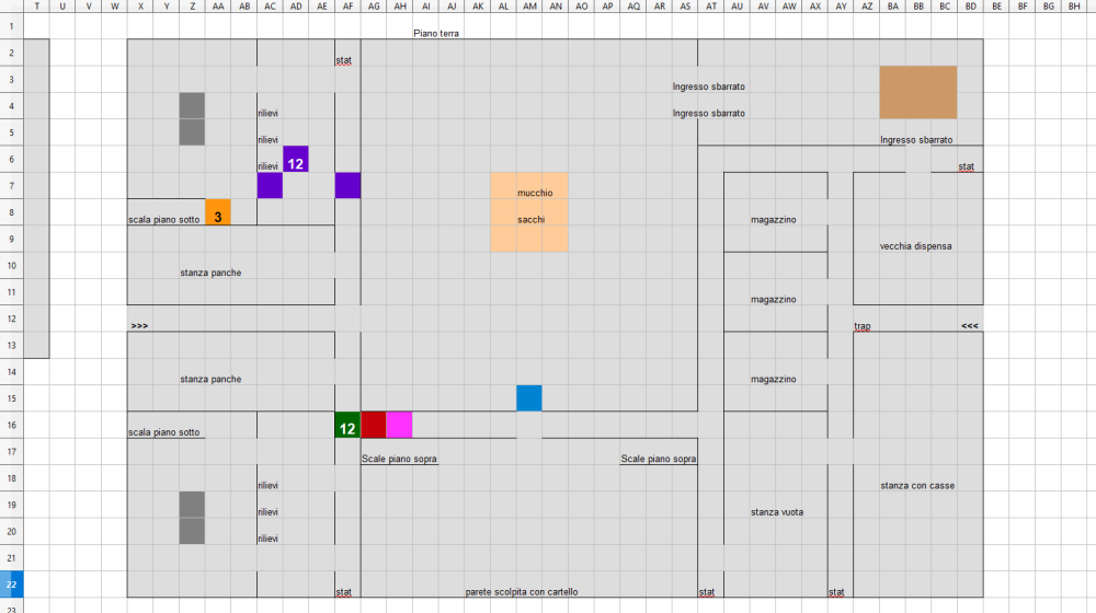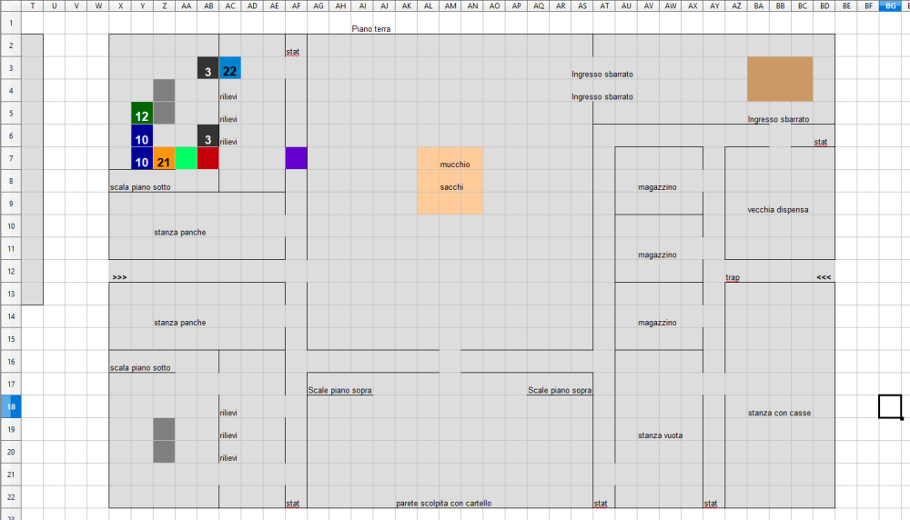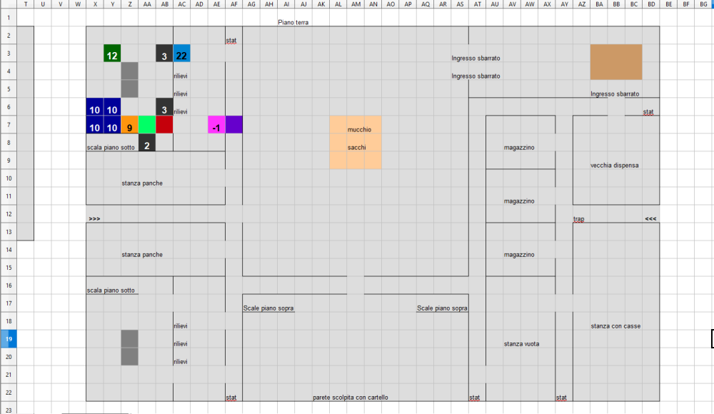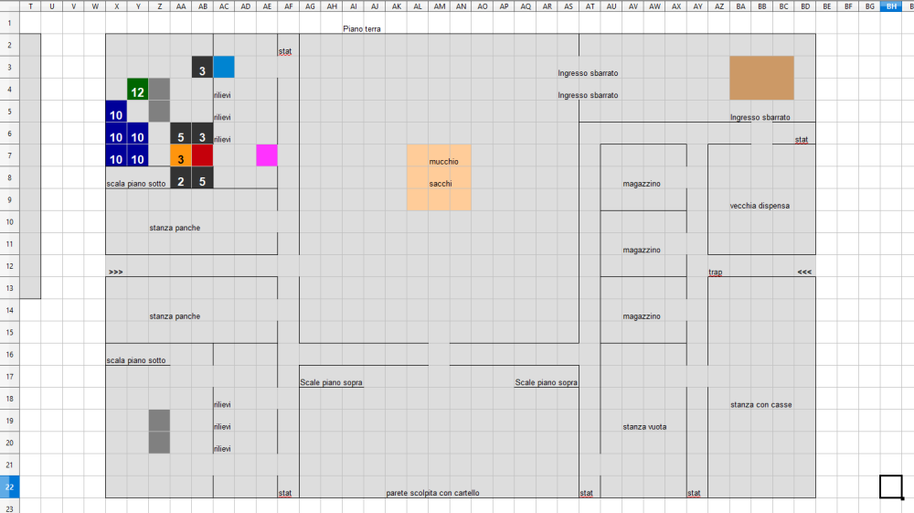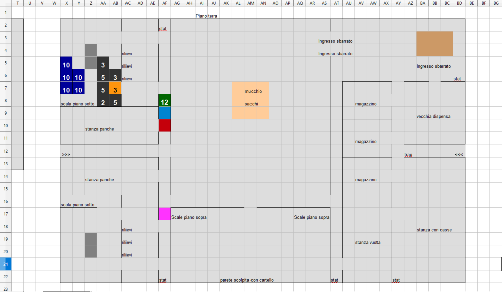 Harlad -Spadone 6+12= 18 colpito danni 2d6+11= 20 danni, ucciso Scatti contro il primo nemico. La sua armatura a bande di metallo sembra resistente, decidi di mirare alla testa. Fai una veloce finta dal basso e poi cambi direzione del colpo all'ultimo facendo fare un arco perfetto alla sua spada. La parata del tuo avversario arriva troppo tardi e la tua lama gli trancia il collo di netto. Uno schizzo di sangue tinteggia la fredda pietra della parete mentre la sua testa rotola tra i piedi di un suo compagno. Allo stesso tempo dall'altra parte Rhael trasformato in un dinosauro trasforma in carne macinata un altro scagnozzo. L'ultimo rimasto, già ferito, vi guarda prima di pisciarsi sotto e svenire. Mikael -ritarda azione a dopo Rhael e poi movimento doppio Inseguendo il nemico ti ritrovi alle spalle di un piccolo ma minaccioso dinosauro che puoi ben suppore sia Rhael. Hai un posto in prima fila per uno spettacolo macabro che ti fa rivoltare lo stomaco. Rhael Proprio mentre parti alla carica Ryfon ti si mette le spalle per lanciare una freccia che centra il tuo bersaglio alla spalla. -2 Artigli 15+7= 22 colpito 7+7= 14 mancato 1d6+4= 7+4 precedenti= 11 danni -morso 17+2= 19 colpito 1d6+2= 7+11 precedenti= 18 danni -coda non puoi usarlo sullo stesso bersaglio del morso -artigliare 14+3= 17 colpito 1d6+3= 8+18 precedenti, ucciso La tua corsa e selvaggia e rapidissima, non ti sei mai sentito così veloce e famelico. Qualcosa di primordiale e famelico si sta svegliando dentro di te. Balzi in aria e atterri con le zampe posteriori sul petto dell'uomo. Il tuo peso scaraventa a terra in balia dei tuoi assalti furiosi. Lo mordi ripetutamente finché non inizi a vederci rosso. Il suo sangue sta schizzando da tutte le parti e ne hai il muso e gli occhi lordi. La tua vittima è diventata un mucchio di carne indistinguibile. Con il muso che gronda sangue guardi l'ultimo scagnozzo rimasto che ha tra i piedi la testa di un suo compagno. Quello guarda Harlad, poi te. Si piscia sotto e sviene. Vi verrebbe quasi da cantare vittoria ma un boato, reso ancora più potente dallo spazio ristretto in cui siete, rimbomba nelle vostre orecchie. Il suono è così forte che vi fa tremare persino le viscere. Ad Harlad che è il più vicino sanguina anche un orecchio. Una tremenda esplosione fa saltare in aria la vostra barricata. Pezzi di legno in fiamme volano per tutta la stanza e qualcuno tintinna contro l'armatura del vostro paladino. Subito dopo un'orda di scheletri esce all'unisono salendo le scale di corsa. Molti vengono distrutti dalle fiamme che bruciano la barricata distrutta, quelli più fortunati circondano Harlad mentre il fuoco ancora li avvolge. Tra di loro corre anche il mago. La sua immagine è sfocata, non riuscite a distinguerne i lineamenti e in aggiunta lo vedete moltiplicato. Non c'è un solo mago ma 6 che si muovono e fanno esattamente la stessa cosa all'unisono. -AdO Harlad 17+12= 29 blur 20% di possibilità di mancare=71 colpito 1d6, 6 è il mago e gli altri immagine speculare= 2 immagine distrutta. Vedendoli passare Harlad ne falcia uno con la spada ma la sua immagine si infrange come uno specchio rotto. Pezzi di vetro tintinnano sulla pietra mentre il mago si posizione in fondo alla stanza. Siete proprio dei figli di pu***na ostinati. Dicono le sue 5 voci all'unisono guardando tutti negli occhi Harlad con il volto rosso dalla rabbia. Ryfon -Movimento+freccia 19+6-4(copertura)= 21 colpito 1d6= 4 danni Thasar -Doppio movimento Mago -Palla di fuoco e movimento (sotto velocità) prende 2d6= 4 danni attraversando il fuoco. Passando avanti ad Harlad gli concede AdO. Scheletri -Corsa, attraversando la barricata distrutta subiscono 2d6 danni. Non vi metto tutti i tiri ma vi dico che sono stati distrutti 30. Quelli sulla mappa sono quelli rimasti. Legenda colori in ordine di iniziativa Rhael -Verde- 12 danni Mikael -Blu- [Ispirazione usata 3/7] Thasar -Rosso- [Infermo -2 TxC, danni, TS, abilità, prove di caratteristica] Mago -Blu scuro- [buff vari, 1d4+2 immagini speculari= 5, 4 rimanenti] Scagnozzi -Viola- Scheletri lavoratori - Nero- Harlad -Giallo scuro- 3 danni [Law e animal devotion 1/10]<--Tuo turno, postate tutti Ryfon -Rosa-