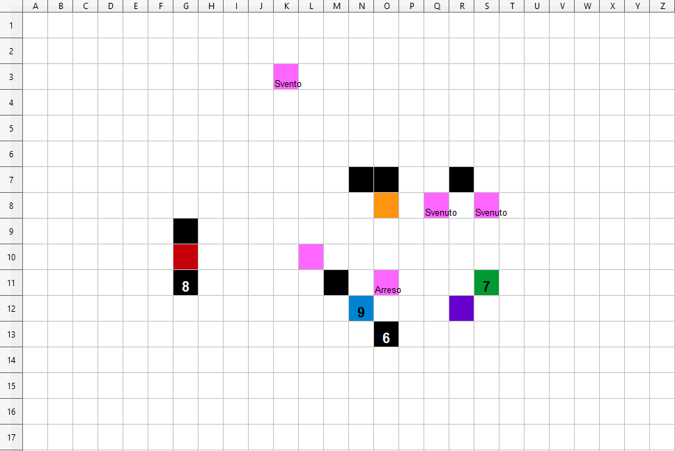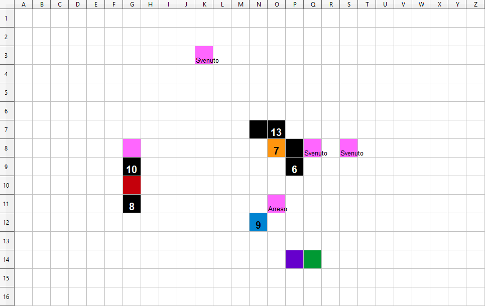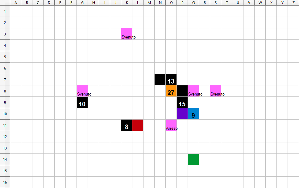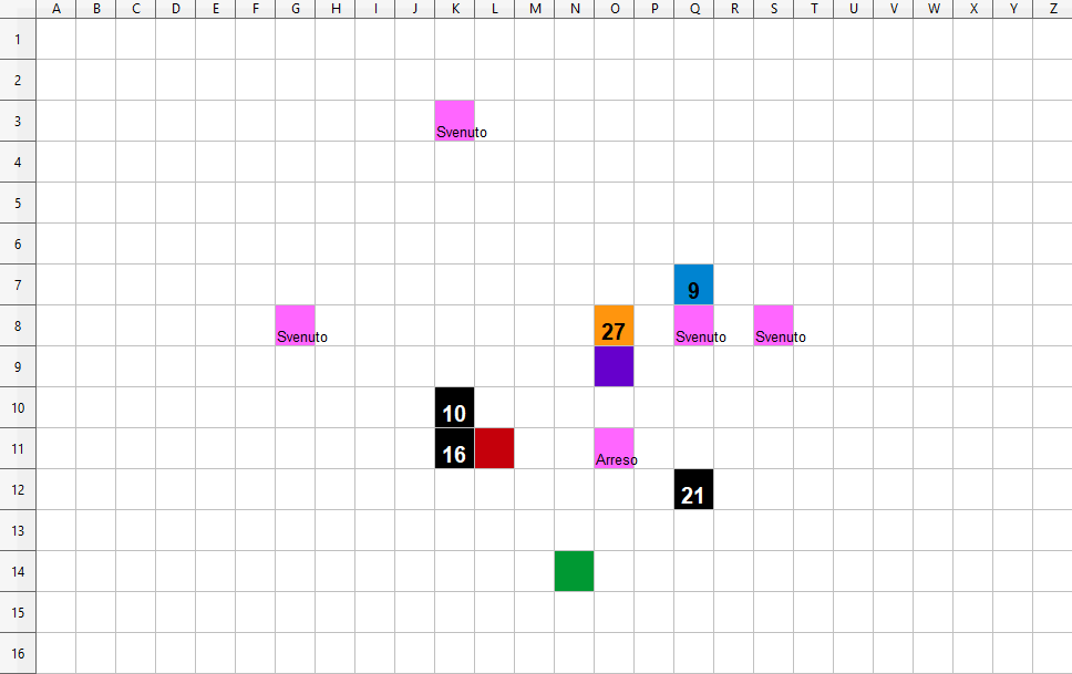 Harlad -Atk sasso 7+7= 14 mancato Nonostante la tua determinazione è difficile combattere prestando attenzione a tutti questi avversari allo stesso tempo. Istintivamente assumi una postura difensiva e quando sferri il tuo attacco è troppo lento e indeciso per cui viene facilmente evitato. -N7 manganello 15+4+2(fianchi)= 21 colpito 1d6+2= 8 danni non letali -O7 manganello 11+4= 15 colpito 1d6+2= 6 danni non letali -P8 manganello 4+4= 8 mancato -P9 manganello 19+4+2(fianchi= 25 colpito 1d6+2= 6 danni non letali per un totale di 27 danni non letali con i precedenti Subito dopo piovono manganellate da tutte le parti. Cerchi di evitarle spostandoti da una parte all'altra ma hai troppo poco spazio per muoverti in modo efficace circondato come sei. Il loro assalto dura solo pochi secondi ma ti sembrano durare un'eternità. Costole e braccio sono contuse ma la ferita più dolorosa è un ciglio spaccato che ti sta rigando il volto di sangue. Le cose sembrano andare molto male ma c'è ancora un barlume di speranza. Con la coda dell'occhio vedi due prigionieri che era in cella con te venirti ad aiutare. Il chierico di Tyr e la ragazza dai capelli rossi. Gerhard -Spinta di energia 2d6+2= 9 danni(+6 precedenti) TS RIF 5+1= 6 fallito. Prova For 16+2= 18 spinta fallita. Ancora una volta crei energia elementale dal nulla e ancora una volta i soldati ti guardano con stupore e timore. I tuoi attacchi sono stati devastanti ma anche sempre diversi. Questa imprevedibilità ti rende ancora più pauroso, lo leggi nei loro occhi appena punti la mano sulla tua sfortunata vittima. Il tuo proiettile d'aria è difficile da vedere e anche estremamente veloce. Investe in pieno il soldato ma lui stringe i denti si sbilancia in avanti per controbilanciare il colpo e rimane saldo sulle sue gambe. Urla qualcosa ai suoi compagni, non sai cosa dice ma percepisci paura nella sua voce. Kael Sfili l'ascia dalla cintura del soldato caduto, era ben salda e ti fa perdere tempo prezioso. Ma almeno ora sei armato e pronto a combattere come si deve. -Movimento per prendere arma e movimento per prendere posizione [Hai raccolto un'ascia da battaglia 1d8+For] Kurgan -AdO Ritirata 14+5= 19 mancato Ti divincoli dai nemici e ti fai spazio tra rami e cespugli a forza pur di allontanarti. Quando arrivi al nemico abbattuto noti che a terra c'è ancora il suo manganello. [Fa solo danni non letali, raccogliere l'arma da terra è un azione di movimento] L'altro prigioniero che ti era venuto ad aiutare prova a seguirti ma viene subito abbattuto da un colpo alla testa con l'impugnatura del martello da guerra. Rimane indietro privo di sensi. Astrid Insegui il nemico che ti è appena sfuggito e senti che questa volta è quella buona. [doppio movimento per raggiungere la posizione] --- -G11 doppio movimento -G9 sconfigge ultimo prigioniero con un attacco non letale Il bosco non particolarmente fitto però ostacola comunque i movimenti. Tutto il terreno è da considerarsi impervio e quindi il movimento costa doppio. Legenda colori: Nero - soldati Rosa - prigionieri Rosso - Kurgan Blu - Kael (9 danni NL) Verde - Gerhard (punti potere/giorno usati: 11/25) Viola - Astrid Giallo - Harlad (27 danni NL)