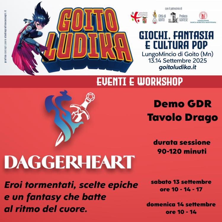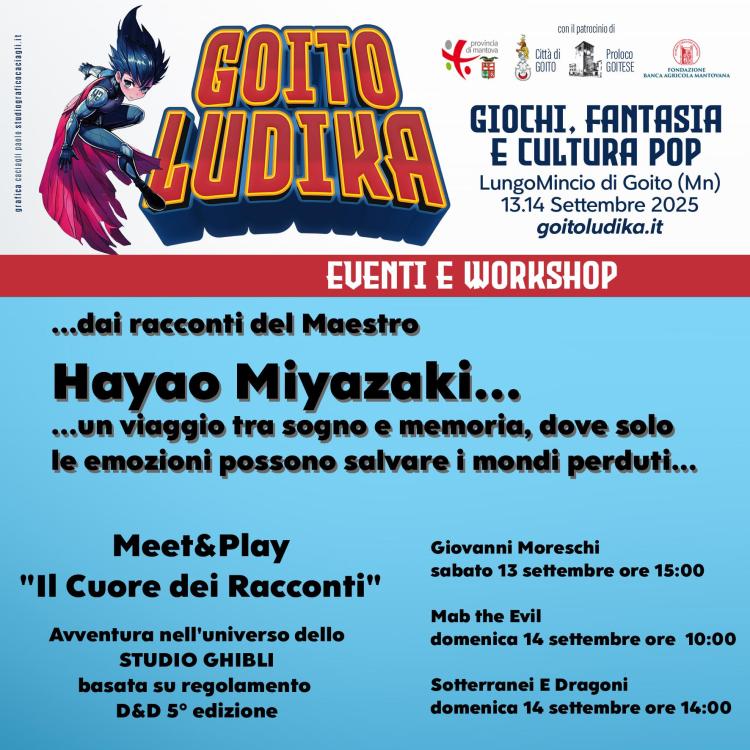 Ciao a tutti! Segnalo un evento che potrebbe interessare chi ama fumetti, giochi, cosplay e cultura pop: Goito Ludika, che si terrà a Goito (MN) il 13 e 14 settembre 2025. La fiera è pensata come un punto d’incontro per appassionati e curiosi, con tanti eventi gratuiti: Demo di GDR con tavoli per diverse esperienze di gioco Meet&Play per giocare insieme a creator e ospiti Laboratorio di disegno per bambini Torneo di Subbuteo E l'immancabile Concorso cosplay Tra gli ospiti ci saranno Paolo Barbieri, Guiomar Serina, Nunziante Valoroso, Andrea Dentuto, l’associazione culturale dedicata a Leiji Matsumoto, e tanti altri artisti, autori e content creator. L’idea alla base di Goito Ludika è valorizzare la divulgazione della cultura pop, nerd e geek, creando occasioni di dialogo con gli ospiti e attività interattive. La fiera, così come per tutti gli eventi (compresi quelli a numero chiuso, quindi da prenotare!) sono totalmente gratuiti! ^^ Info e programma completo qui: www.goitoludika.it -