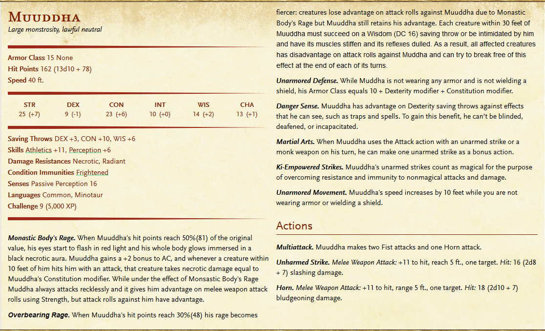 Grazie a tutti delle risposte 🙂 Il mio problema principale è fornire al mostro le capacità di Ira e flurry of blows al mostro, oltre che l'abilità di 3° livello del barbaro wild. Delle abilità (dato che sono random lanciando 1d8) potrei tenere unicamente quella che ne aumenta la ca ed infligge danni da forza, non saprei comunque come calcolare il cr basandomi su queste capacità, comunque cercherò di partire da uno statblock del mm di un mostro di cr 9 e monterò le abilità da lì, grazie 🙂