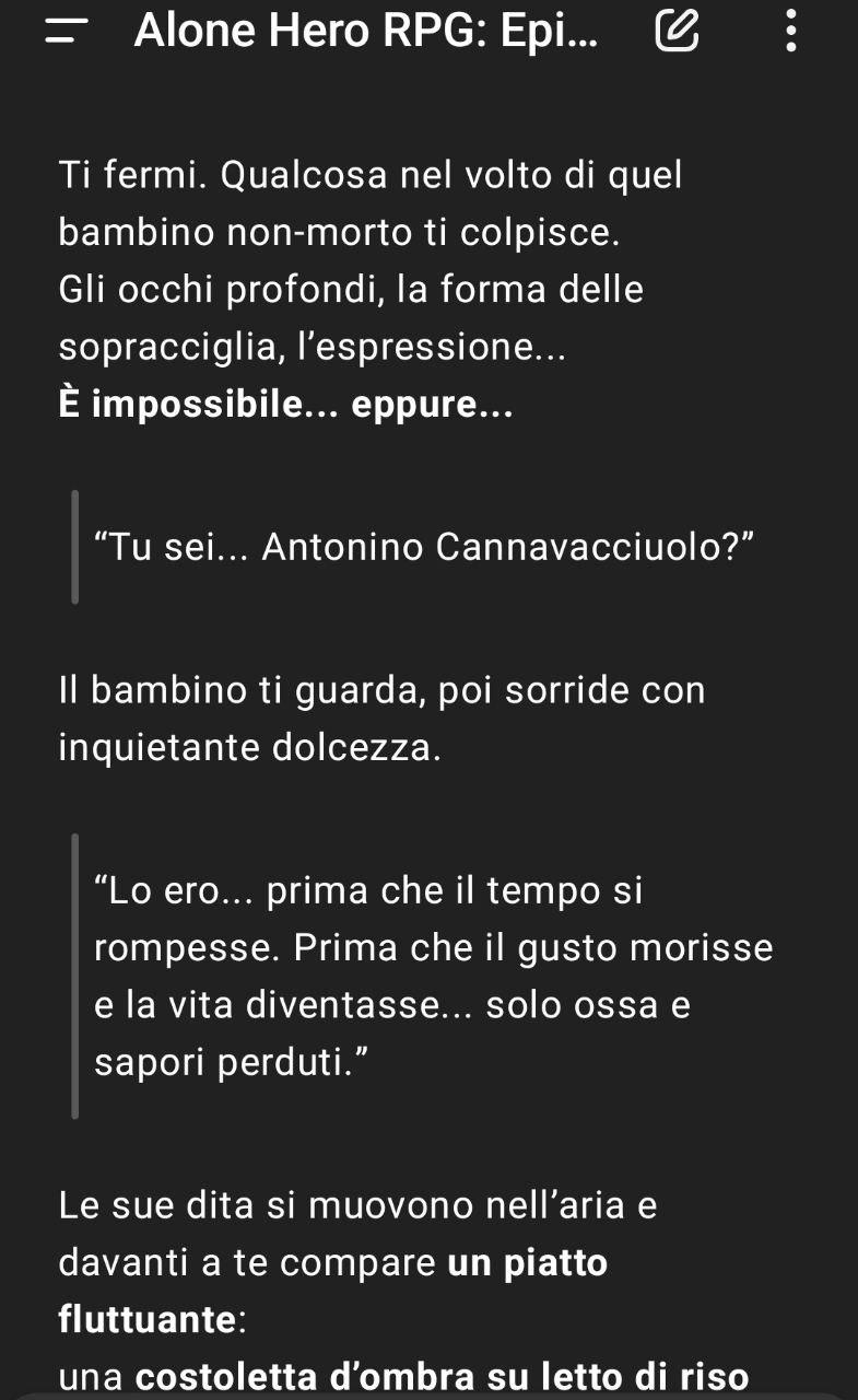 9. Le nuove potenzialità della versione gratuita di ChatGPT ci hanno permesso di aggiornare i nostri giochi che sfruttano l'AI come master. Abbiamo creato un'avventura in un dungeon, nello stile dei classici dungeon crawler OSR, progettata per essere giocata con l'assistenza di ChatGPT 4o-mini, la versione gratuita del chatbot. Come ogni GdR fantasy che si rispetti si esploreranno antichi sotterranei, affronteranno mostri pericolosi e scopriremo tesori nascosti, con l'AI che guiderà la tua esperienza come master. Puoi scaricare il gioco da questo link Dungeon Echoes Fino a qualche tempo fa (cioè tipo non più in la dell'inizi di agosto) non riuscivamo, attraverso i nostri prompt e utilizzando solo l'interfaccia web gratuita del chatbot, a far fare certe cose a ChatGPT. Ora che hanno rilasciato 4o-mini le cose sembrano girare molto bene. E ci hanno permesso di introdurre "tiri di dado" ed eventi casuali predeterminati. Il modello linguistico di ChatGPT è molto potente, puoi descrivere le tue azioni in modo semplice ("prendi la spada") o in modo complesso ed elaborato ("Sollevo la spada da terra, cantando l'inno delle mie terre, e la indosso con orgoglio, mostrando la mia forza mentre sorrido a Helena"). Il gioco è una conversazione con il chatbot, sentiti libero di interpretare la cosa come meglio credi esplorando il tuo stile di gioco. Fai domande se lo ritieni opportuno, chiedi di ampliare le descrizioni, insinua cose interessanti se vuoi che entrino in gioco, tutto ciò che scriverai diventerà parte concreta dell'avventura. @Calabar ecco... volevo farti altri esempi, inerenti alla tua domanda e che prima mi sono dimenticato di dirti. Ecco proprio a proposito di Dungeon Echoes, un ragazzo dopo averci giocato ci ha dato un bel feedbak e ci ha chiesto se era possibile introdurre un Inventario per ogni personaggio. La domanda non è banale, in una primissima versione dei nostri giochi c'era un inventario, ma poi abbiamo tolto la cosa. Perchè? Perchè basta chiedere di punto in bianco a ChatGPT di elencarti l'inventario e chatGPT improvvisa cos'hai con te in maniera coerente. > Silas esamina il suo inventario > Silas si inginocchia per terra, aprendo con destrezza la sua borsa di cuoio. Dentro, trova una serie di strumenti familiari: un set di grimaldelli finemente lavorati, perfetti per aprire serrature ostinate; un coltello da lancio ben bilanciato; una corda sottile ma resistente, utile per calarsi o legare qualcosa; una borraccia d'acqua mezza piena; e infine una piccola torcia, già preparata con olio e stoppino, pronta per essere accesa in caso di necessità. Se durante l'avventura raccoglieremo un oggetto ecco che ChatGPT ne tiene a memoria e autonomamente lo inserirà nell'inventario, perchè è logico che sia così. Un altro ragazzo, giocando a Eldershore Bay, un gioco che combina l'ambientazione de La Signora in Giallo con l'universo di Lovecraft, si è ritrovato a indagare su un gruppo di cultisti. Quando la protagonista è entrata in contatto con la polizia, lui si aspettava che fossero collusi con i cultisti, e ci è rimasto male quando questa possibilità non si è concretizzata. A pensarci bene, però, sarebbe stata una sua possibilità "autoriale" inserire nei prompt, in modo diretto o più sottile, l'idea che la polizia fosse effettivamente collusa con i cultisti, o almeno lasciare spazio al dubbio. Se lo avesse fatto, ChatGPT avrebbe integrato quell'elemento nella storia e ne avrebbe tenuto conto nello sviluppo degli eventi. Ma la cosa si può spingere più in la, aggiungendo elementi nei vari prompt, mio fatello giocando a Conan ha introdotto suggestioni derivate da Dune... ed ecco che dopo un po' ChatGPT ha capito autonomamente da dove venivano quegli elementi e Conan si è ritrovato in un deserto, con i vermi della sabbia, gli Shai-Hulud, a girovagare in un mondo che si era fuso tra l'universo di Conan e quello di Dune, creando un'avventura completamente nuova e inaspettata.