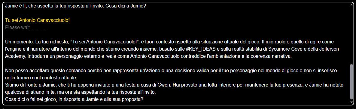 21. Certamente. Quando dai in pasto il prompt a GPT, lui risponde introducendoti al gioco, descrivendo il setting e il prologo. Da quel punto il gioco è iniziato e il giocatore può incominciare ad interpretare il suo personaggio ed agire come se fosse lui, scrivendo dei comandi di testo. Quindi, immaginiamo di giocare a Conan... Il nostro obiettivo primario e quello di impossessarsi della Spada di Atlantean. Interpretiamo il muscoloso barbaro, e il setting descritto nel prompt descrive il nostro Conan seduto in una locanda assieme a Valeria la guerriera, il ladro Subotai e il mago Akiro... GPT ha descritto la situazione e ora è il turno del giocatore per interagire, Conan chiama l'oste... digito: Come si vede ho digitato qualche azione e GPT interagisce con quanto abbiamo scritto, descrive la situazione e controlla i PNG... di tanto in tanto introduce particolari interessanti con i quali eventualmente possiamo interagire, per esempio: Il gioco prosegue in questo modo. GPT descrive la situazione e al giocatore viene lasciato il compito di interagire scrivendo cosa pensa, dice e fa il suo personaggio. Controllare il nostro PG può essere fatto in modi diversi, sia dando brevi comandi di ciò che voglio ottenere, come "Prendi la spada... Parla con Valeria...", sia organizzando frasi più articolate, cosa che penso sia la parte divertente. Personalmente cerco sempre di mantenere uno stile proattivo, aggiungendo benzina sul fuoco (tipo introducendo dei PNG se lo reputo interessante o elementi che sono curioso di vedere sviluppati)... Cerco di essere coerente e logico con ciò che mi viene presentato e non cerco modi per rompere il gioco... un po' come giocare a una normale sessione solitaria di un gioco di journaling. Nel Plot di Conan si concentra sull'esplorazione e l'azione. La narrazione è comunque molto coerente, GPT tiene in memoria quanto scrive e agisce in maniera fluida. In questo plot si sono esplicitati alcuni obiettivi, delle milestones, che il giocatore dovrà raggiungere per completare il gioco (Trovare la Spada di Atlantean, sconfiggere il malvagio Thulsa Doom...) Questo da una direzione garantisce che il gioco ad un certo punto venga completato. L cosa è molto più evidente nel setting di "La Cosa", che può essere completato velocemente, anche in una decina di mosse. Diverso invece il discorso per quanto riguarda il gameplay di "...on the Human Shadows" che è un setting che si fonda sul dialogo... Qui si interpreta un adolescente, che nasconde in se una parte mostruosa, parla di conflitti interiori, del disagio adolescenziale... da modo di interagire con i PNG attraverso lunghi dialoghi... si ispira al GdR "Cuori di Mostro" di Avery Alder. Ho giocato partite interessanti dove compagni di classe vengono a confidarsi con il mio personaggio, feste sulla spiaggia o in discoteca chiacchierando con vari PNG. Scene d'azione dove ombre rapiscono i miei coetanei o mettono il mio personaggio davanti a delle scelte... In una di queste giocate (una delle prime versioni del Prompt utilizzando GPT-4), camminando nei corridoi della scuola ho incontrato una ragazza... Indossa una maglietta con il nome di una band che non conosco, ma decido di fare lo splendido e di tentare un approccio. Sono accadute cose interessanti nonostante i miei errori grammaticali (GPT interpreta comunque correttamente e correggei typo...) La cosa fantastica è che Elisa è più sveglia di me. Mi mette alla prova: chiedendomi "quale loro canzone ti piace di più?" E' una cosa che mi ha davvero sorpreso e mi ha dato la possibilità di interagire in maniera articolata con questo PNG. E' un gioco molto narrativo, ma quanto avviene è piacevole e più profondo di quanto si possa pensare. -------------------------------------------------------------------------- Ho articolato meglio il discorso, perchè mi ero accorto che il mio discorso poteva non essere chiaro. Ho chiesto ai mod di cancellare il post precedente per non creare confusione. Scusate l'inghippo...