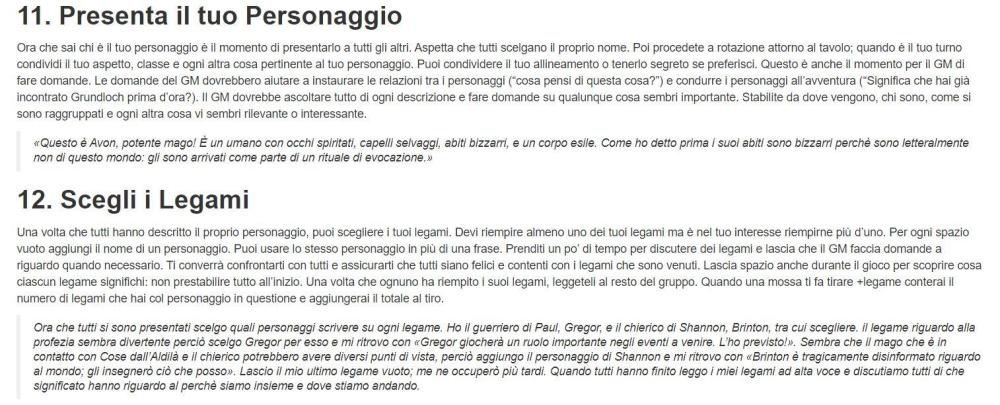 Dopo aver discusso qui tra voi quali classi giocare, e dopo che avremo deciso dove/come uploadare le schede, seguite passo passo questa creazione: https://www.dungeonworld.it/creazione-personaggi Poi, come descritto al punto 11 (vedi allegato qui), vorrei che descriveste un po' il vostro personaggio. A quel punto inizierò a porvi domande, sia per approfondire il personaggio stesso, sia per consentirvi di dare le prime "spennellate" al nostro mondo di gioco, la nostra creatura ❤️ In seguito, e solo in seguito passerete al punto 12: scegliere i legami. Avremo definito meglio i pg, il mondo, l'ambientazione, e perciò stabilire qualche legame tra i vostri personaggi verrà quasi naturale. Che dite come programma?
