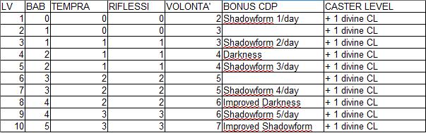 Allora mi pare che non esistesse uno shadow priest, perciò ho tentato di farne io uno ^^ E' una Cdp ovviamente REQUISITI Caster Level: 5° Knowledge (Religion): 5° Alignement : Any non-goog TABELLA PROGRESSIONE Allegata alla fine SPIEGAZIONE BONUS °SHADOWFORM: Come un'azione gratuita, puoi attivare la ShadowForm. Mentre essa è attiva, non puoi lanciare magie di cura. Tutte le magie "Infliggi" sono lanciate a LIV. INC. +1. La SHADOWFORM dura (Liv. Inc. /2 + Mod. Spirito /2) turni. Può essere disattivata in qualsiasi momento come azione gratuita, ma comunque l'utilizzo giornaliero viene sprecato anche se disattivata volontariamente. °DARKNESS: Gli incantesimi "Infliggi" che lanci vengono lanciati come se fossero sotto l'effetto del talento Incantesimi Potenziati, ma lo slot magia che essi occupano non aumenta. °IMPROVED DARKNESS: Gli incantesimi "Infliggi" che lanci vengono lanciati come se fossero sotto l'effetto del talento Incantesimi Massimizzatim, m alo slot magia che essi occupano non aumenta. Improved Darkness sostituisce completamente Darkness e tutti i suoi effetti. °IMPROVED SHADOW FORM Mentre sei nella Shadow Form, lanci incantesimi "Infliggi" a LIV. INC. +2 (e non +1). Inoltre lanci gli incantesimi "Infliggi" sia come Massimizzati che Potenziati.