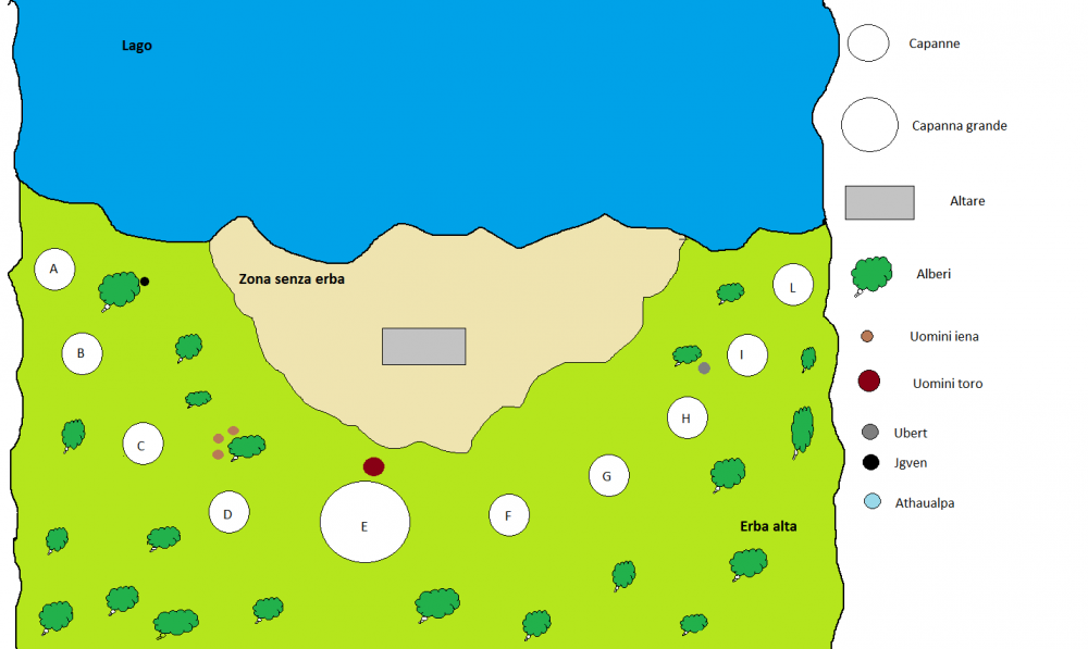 Jgven dal suo nascondiglio lascia partire due frecce che colpiscono in pieno l'uomo iena che stava spegnendo il fuoco uccidendolo all'istante... @ Jgven Ubert esce dalla capanna in cui si trovava...poi le cose diventano più movimentate ... Da una capanna (D) vicina alla capanna grande escono tre uomini iena armati di tutto punto impugnano una lancia ed imbracciano uno scudo , i tre si guardano intorno guardinghi... @ Tutti Ubert gli scaglia subito contro in rapida successione quattro frecce ma solo tre che magicamente diventano sei raggiungono il proprio bersaglio colpendo due volte ogni nemico visibile... @ Ubert Gli uomini iena capita la direzione da cui sono arrivate le frecce ma non riuscendo ad individuare chi le ha lanciate si nascondono dietro l'albero che si trova li davanti... Poi dalla tenda grande esce un uomo toro con passo lente solenne , impugna una grande ascia bipenne e per il resto è nudo coperto solo dalla propria peluria...il bestione rimane in attesa guardandosi attorno come se aspettasse qualcosa... @ Uomo toro @ Mappa @ Tutti