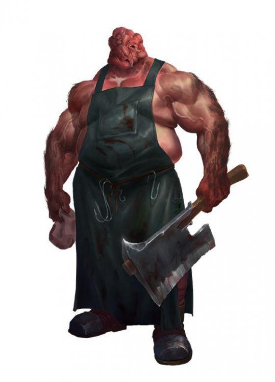 Vi posizionate nella stanza e dopo alcuni interminabili secondi la porta si apre e due grosse figure entrano nella stanza borbottando qualcosa di incomprensibile fra loro e si accorgono di voi solo quando gli siete addosso...le due grosse figure vi sembrano umane , sono alte circa un metro e ottanta , con un fisico massiccio pieno di muscoli , portano un pesante e spesso grembiule da macellaio sporco di sangue , ai piedi hanno dei grossi stivali di metallo sporchi di sangue ed escrementi , il primo impugna una grossa mannaia sporca di sangue ed interiora mente il secondo impugna un grosso uncino anch'esso sporco di sangue...il fatto per cui non siate certi siano umani è il loro volto che è una massa informe , come fosse stata sciolta dal calore senza bocca o naso e da cui spunta solo un inquietante occhio... @ Mappa @ Umanoidi @ Tutti @ Astrid @ Gnorman