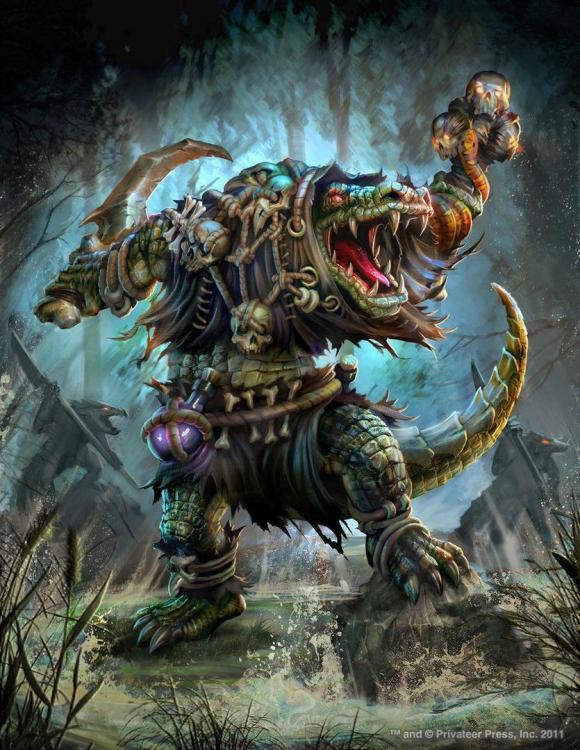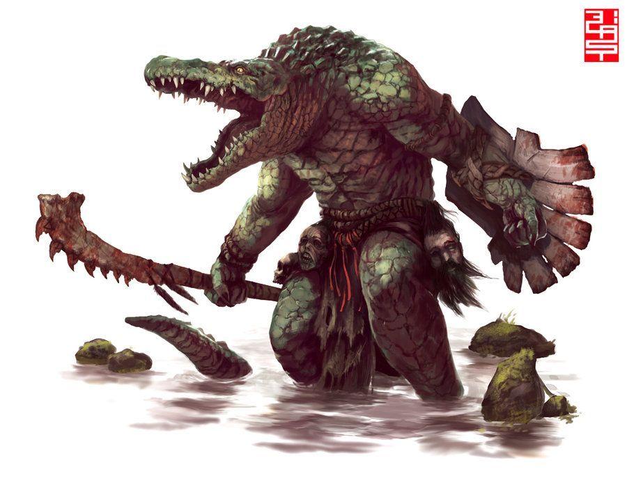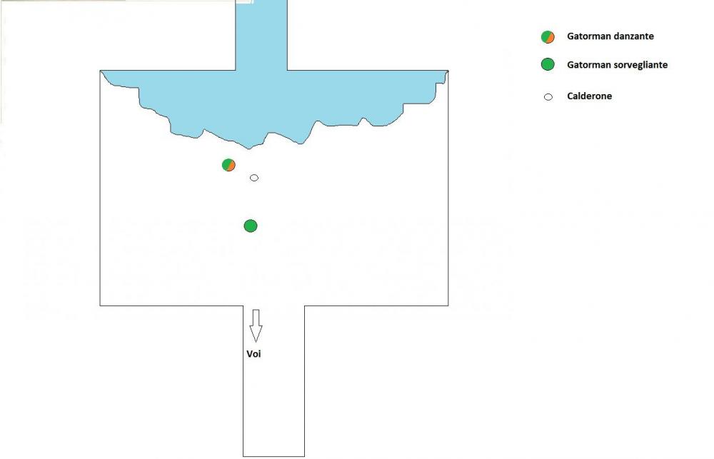 14. Sempre con la luce di Dalia a fare da apripista avanzate lungo il tunnel verso destra e a mano a mano che avanzate l'odore di fumo si fa più intenso ...dopo diversi minuti che camminate capite il perchè , arrivate in una grande sala molto simile alla sala di stoccaggio delle acque che avete oltrepassato su nelle fogne , questa però è per la maggior parte interrata e con solo la parte più in fondo rispetto a voi coperta da dell'acqua e al centro si trova un falò su cui è poggiato un calderone e li attorno due massicce figure che assomigliano molto al grosso uomo lucertola simile ad un coccodrillo che avete ucciso prima , solo che uno porta un lacero gonnellino di stoffa ed ha il corpo disseminato di piccole ossa di animali , ampolle e teschi e in una mano impugna un grosso pugnale mentre nell'altra sollevata impugna una specie di scettro fatto di ossa , l'altro indossa anch'esso un lacero gonnellino di stoffa adornato da teste umane mozzate e imbraccia un grezzo scudo di legno ed impugna una grande spada fatta d'osso...il primo sta danzando intorno al calderone facendo vari versi che supponete possano essere di un qualche linguaggio a voi sconosciuto , supponete anche che stia officiando un qualche tipo di rituale mentre il secondo sorveglia la zona a protezione del primo...vi pare poi che ci sia qualcosa nell'acqua , come dei pali ma data la luce di Dalia e la distanza non riuscite bene a capire cosa siano... @ Sala @ Gatorman danzante @ Gatorman sorvegliante @ Tutti