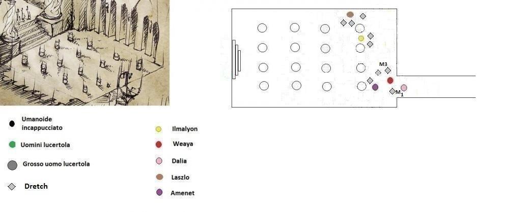 Laszlo continua imperterrito ad attaccare ed un altro dei demoni finisce maciullato fra le sue mani... @ Laszlo @ Dalia Dalia continua a tessere le sue malia sui demoni ed un altro di loro cade sotto il suo influsso... @ Dalia Ilmalyon ancora sotto l'effetto della nebbia non può far altro che scappare e anche questa volta riesce con abilità a scavalcare i dretch che lo tallonano ed ad allontanarsi... @ Ilmalyon Weyia continua ad attaccare i dretch che le stanno intorno e con due rapidi colpi ne colpisce due , ed uno già ferito in precedenza si accascia al suolo senza vita... @ Weaya Amonet dal canto suo continua ad attaccare i demoni riuscendo nuovamente ad eliminarne uno... I demoni sono stati ormai decimati ma ciò non sembra in alcun modo deprimerli o intimorirli , anzi vi pare quasi che stiano sorridendo...e col sorriso stampato sui loro deformi volti continuano ad attacarvi... Uno dei demoni che seguiva ilmalyon stanco di seguire le sue piroette si dirige a dar manforte ai suo confratelli contro Laszlo senza pero riuscire ad arrivare in tempo per attaccare...gli altri due demoni rimasti contro Laszlo riescono ancora con fortuna a ferire il colosso che inizia a perdere sangue in maniera copiosa... @ Laszlo Il Dretch rimasto contro Weaya non riesce a colpire cosi come i suoi due compagni rimasti , uno contro Dalia e uno contro Amonet... L'ultimo Dretch ad agire si avvicina a weaya ma non arriva in tempo per attaccare... La situazione pare ormai volgersi al meglio per il gruppo quando la luce dei braceri che permeava la sala si interrompe all'improvviso facendo sprofondare tutto nell'oscurità più totale... @ Mappa @ Tutti