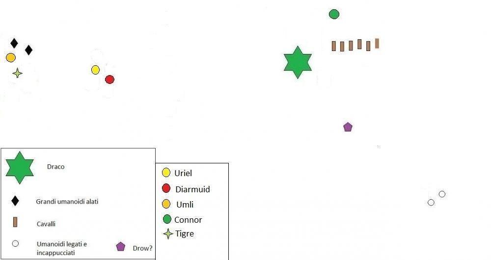 La situazione da sembrare disperata volge velocemente a vostro favore...due dei grandi umanoidi alati ancora sotto l'effetto del colpo di Umil rimangono li fermi ad aspettare non riuscendo bene a capire che cosa gli stia succedendo...Umil cosi decide di lasciarli stare ancora per un pò e rivolge la sua attenzione all'umanoide alato più vicino e lo colpisce con un paio di potenti colpi sul retro del ginocchio destro , il grande umanoide grida di dolore e si inginocchia e prima che possa decidere di fare qualcosa la tigre di Connor gli salta addosso mettendo fine alla sua esistenza... @ Umil @ Tigre Diarmuid non è da meno w con due possenti colpi abbatte il grosso umanoide alato che aveva vicino... @ Diarmuid poi nere nuvole si addensano sopra la drow volante che sta combattendo contro il drago e un fulmine sta per colpirla ma poco prima di arrivare a bersaglio viene deviato come da una forza invisibile e si scarica a terra senza fare danni... @Connor La drow volante comunque pare aver capito l'andamento della battaglia e schivando ancora una volta l'attacco del draco lo colpisce ad un ala con la sua mazza , la creatura subisce il colpo e perde quota arrivando a circa un metro da terra prima di riuscire a fermare la caduta e la drow volante intanto inizia ad allontanarsi... @ Mappa