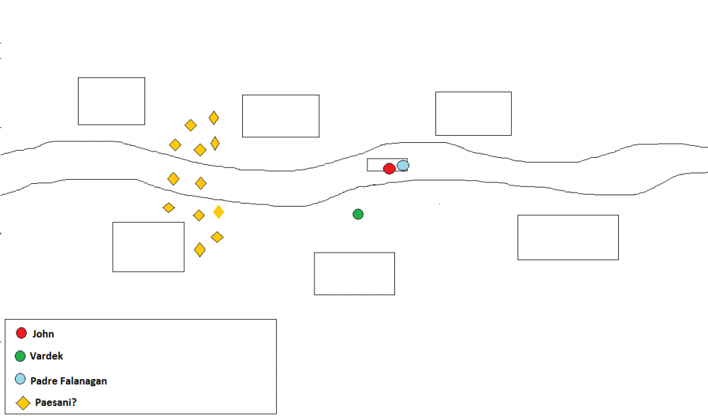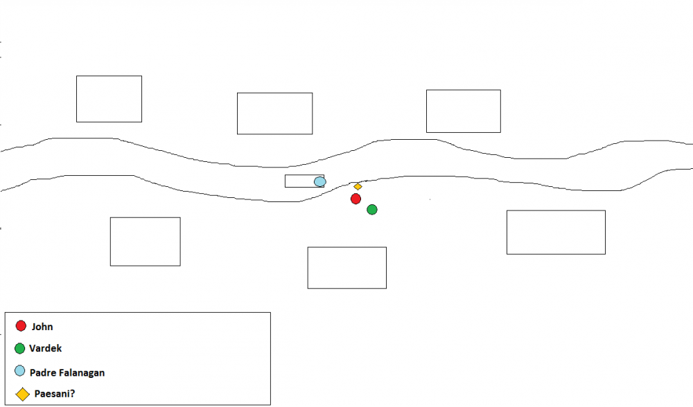 Vardek colpisce anche l'altro bambino con forza frantumandogli il cranio e ponendo fine alla sua esistenza ... John intanto raggiunge con un balzo il carro e cerca di togliere le redini dalle mani del sacerdote che però si rivela essere un tipo decisamente tosto e nonostante l'asalto non molla le redinio rispondendo con una testata che benche non faccia alcun danno a John lo allontana di qualche centimetro...Smettila rischi di far imbizzarrire i cavalli se vuoi fermarmi dovrai uccidermi...urla il prelato...dobbiamo andarcene subito...e tu...fa rivolto a Vardek ...se hai finito di giocare salta su... john sta per dare al prelato quello che vuole quando si accorge che dalle case dietro di voi sono usciti altri paesani inferociti , saranno almeno una dozzina , tutti adulti armati di forconi asce e roncole... @ John @ Vardek @ Mappa
