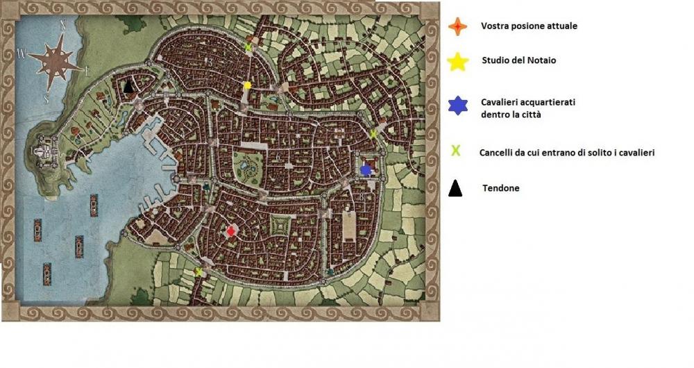 Mi pareva che fosse smaniosa di sapere quanto avrebbe speso , ma lasciamo perdere...fa Solomon rivolto a Basandra , poi mette mano allo zaino e tira fuori un altra mappa della città...E' facile guardate...e se non aveste creato tutta quella confusione la fuori avreste avuto più possibilità ma ora non so , avranno intensificato le pattuglie per cercarvi e non so quanto vi convenga scontrarsi ancora con loro...detto questo...tralascerei di andare nella direzione dove avete assalito i cavalieri , perciò come avevamo detto in precedenza vi conviene passare dal parco centrale , uscite di qui e prendete la strada subito a sinistra la percorrete fino alla fine oltrepassate il cancello e prendete la strada che parte da li andate sempre dritti fino ad una piazza , da li prendete l'ultima strada a sinistra e la percorrere fino in fondo arriverete ad un altro cancello , oltrepassatelo e vi troverete nella piazza dove si dovrebbe trovare la casa del notaio , da li poi tornate indietro fino all'ultimo cancello che avete passato e seguite le mura verso ovest e poi raggiungere questo punto...ed indica un punto preciso della mappa...il tendone si trova a li...vedete voi cosa fare prima e cosa fare dopo... @ Tempo @ Mappa