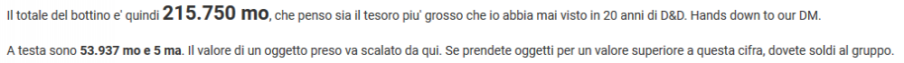 Troppo. Infatti sto molto apprezzando il clima "luterano" della 5 ed., dove appena arrivi a modificatori sopra la decina e' gia' WHOOOOAAA!!! Andata! Una miniera con albergo, taverna e bordello. Potremmo spendere un po' di tempo intra-avventura per cercare un posto consono alla fondazione di questo nanico paradiso terrestre, se Dalamar e tutti voi siete d'accordo. Gia' mi immagino le brochure che invitano frotte di nani a godersi due settimane di rilassanti picconate alla pietra... e alle femmine. Tornando a noi, c'e' da pensare alla spartizione. Il totale del bottino e' quindi 215.750 mo, che penso sia il tesoro piu' grosso che io abbia mai visto in 20 anni di D&D. Hands down to our DM. A testa sono 53.937 mo e 5 ma. Il valore di un oggetto preso va scalato da qui. Se prendete oggetti per un valore superiore a questa cifra, dovete soldi al gruppo. Ho assegnato gli oggetti "a sentimento", ma ditemi voi.